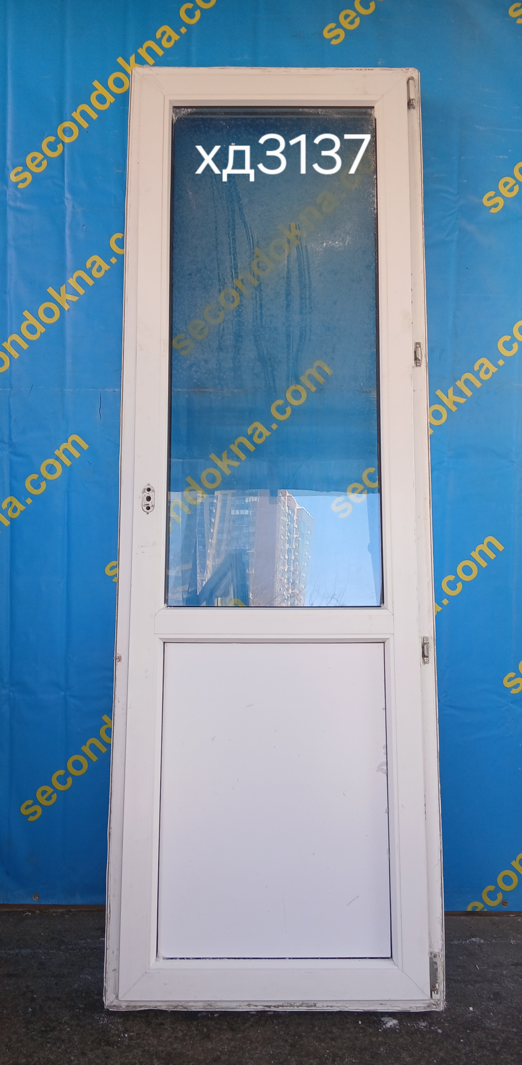 Пластиковая балконная дверь Б/У с однокамерным (2 стекла) стеклопакетом.