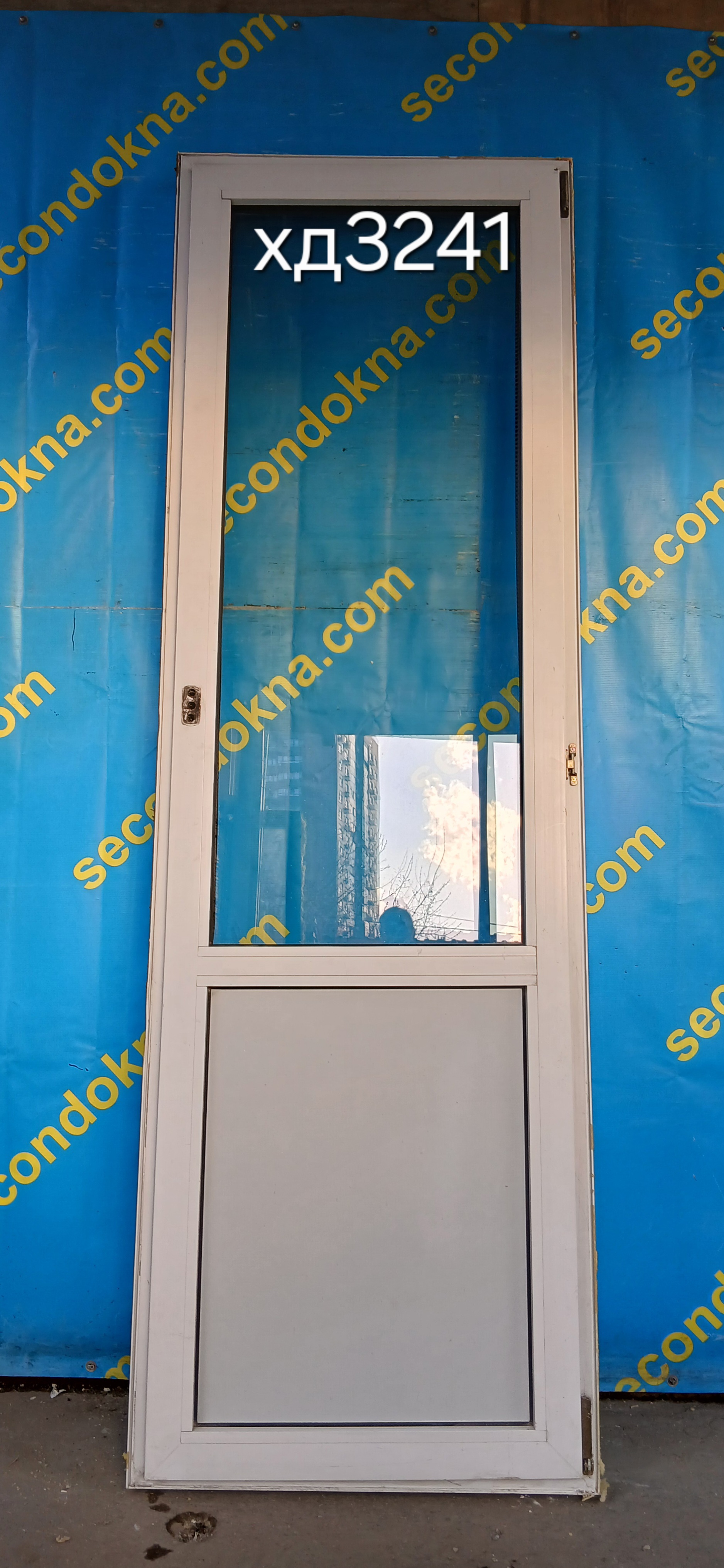 Пластиковая балконная дверь Б/У с однокамерным (2 стекла) стеклопакетом.